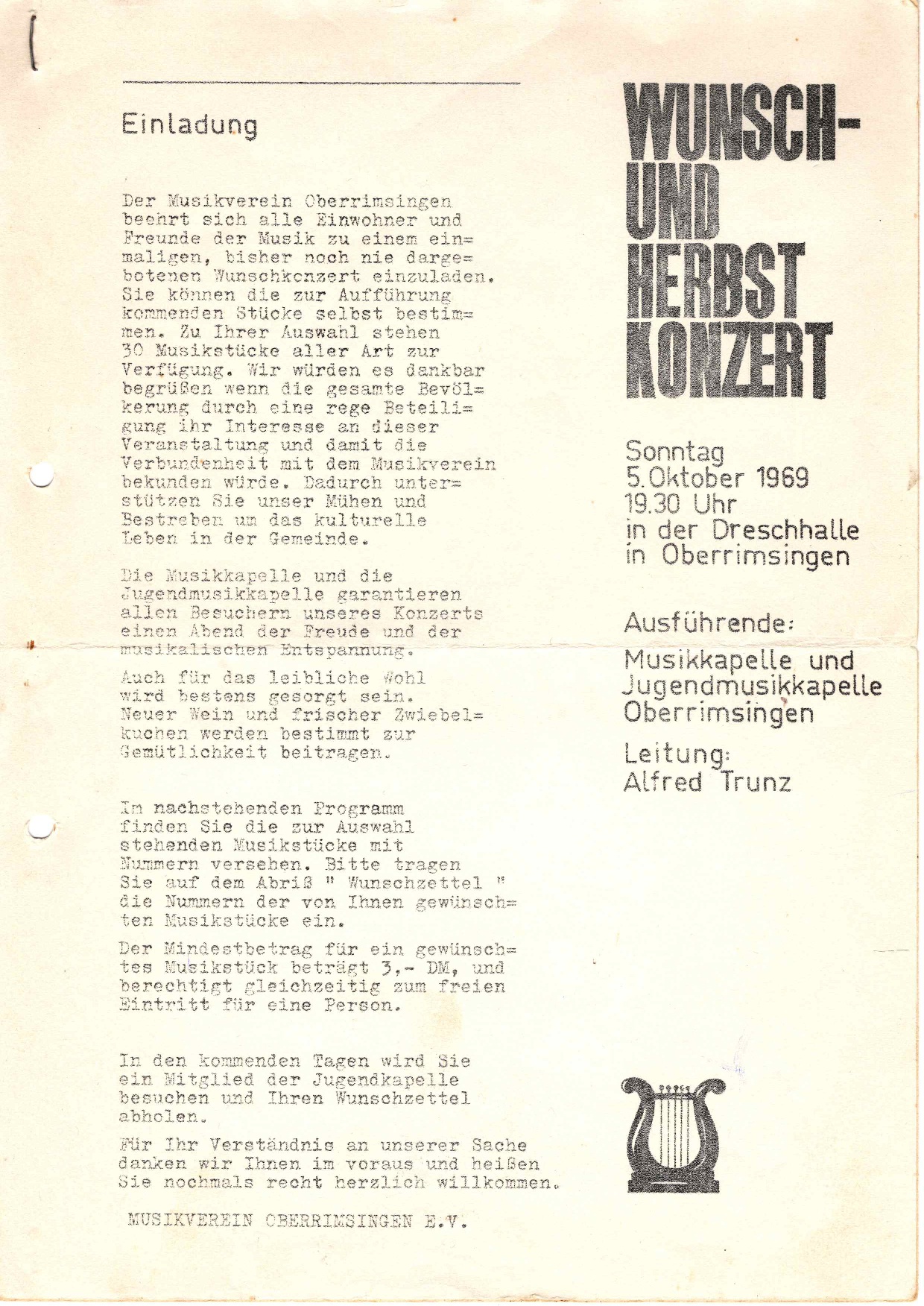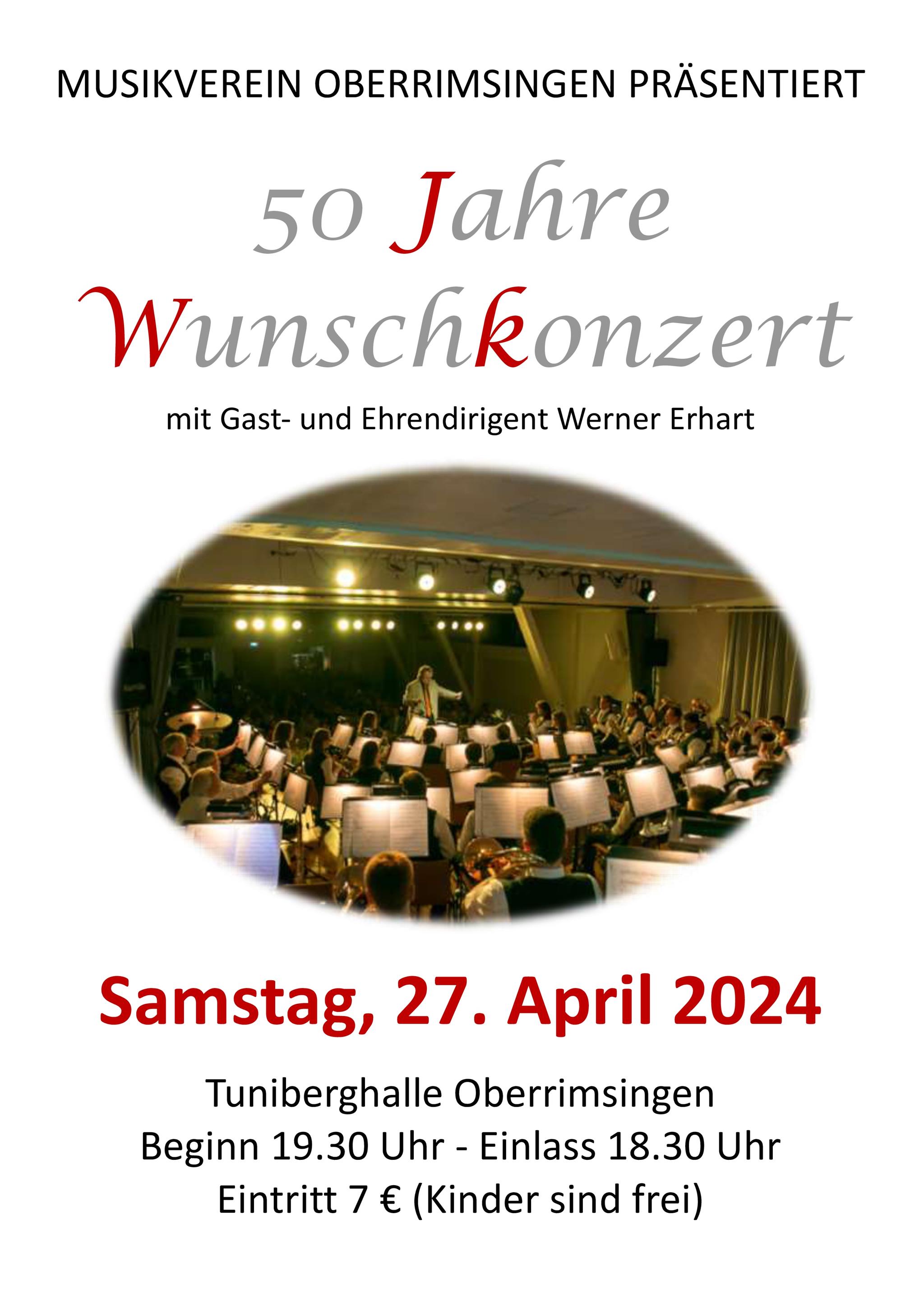 Das Wunschkonzert feierte 2024 sein 50-Jähriges Jubiläum und wurde deshalb nochmal von Gast- und Ehrendirigent Werner Erhart geleitet. Er war 20 Jahre Dirigent des Musikverein Oberrimsingen und wurde 2019 zum Ehrendirigenten ernannt.