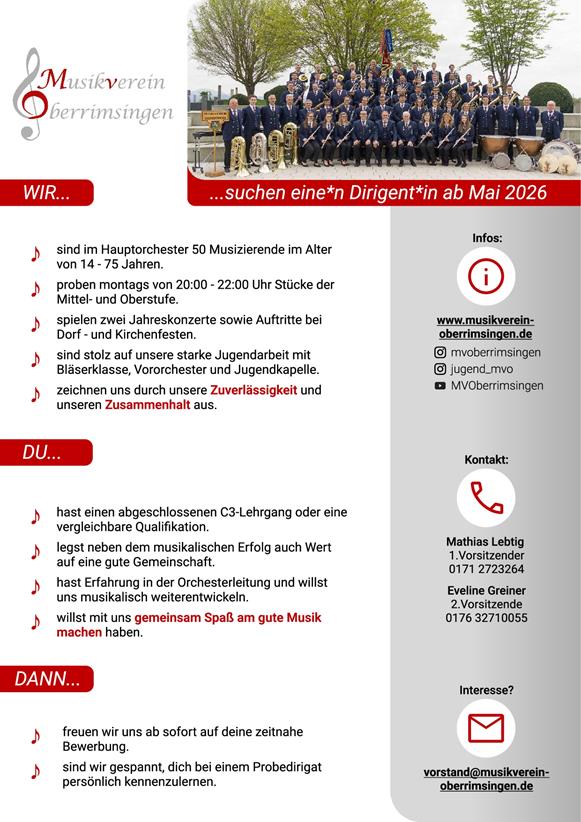 ich freue mich sehr über Ihr Interesse am Musikverein Oberrimsingen e.V. und darf Sie, auch im Namen der Musikerinnen und Musiker, herzlich willkommen heißen!